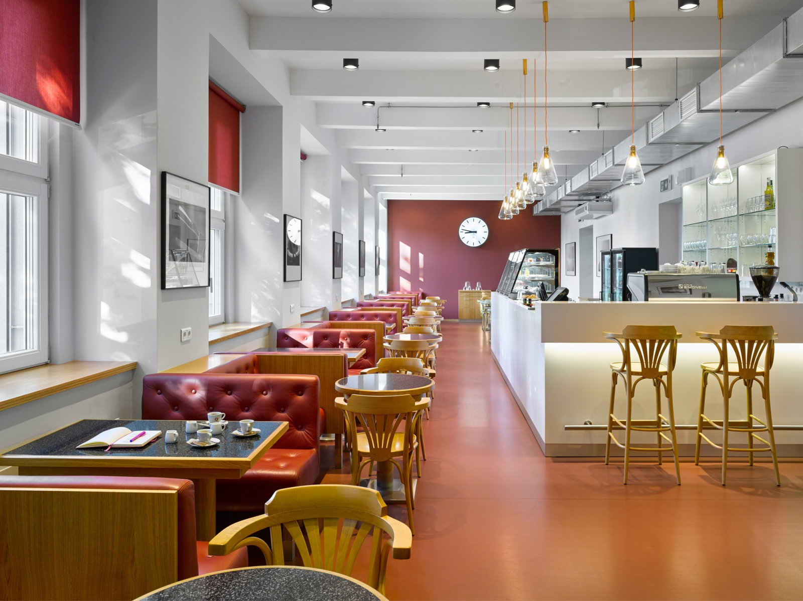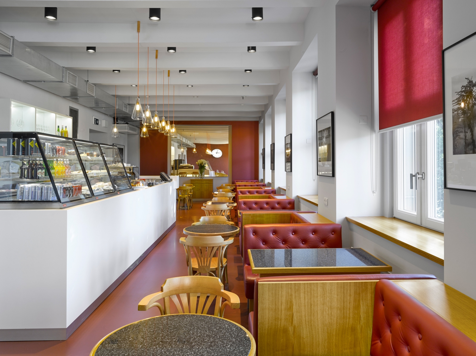 Dřevěné stolky s mramorovou deskou doplňují klasické tonetky v přírodním buku. Na čelní stěně jsou osazeny velké prosvětlené hodiny zrcadlící se v protilehlém velkoplošném zrcadle, bar z bílého umělého kamene nasvětlují svítidla ve tvaru laboratorního skla. Na vstupní prosklené dveře jsme osadili dřevěná madla v klavírovém laku s mosazným kováním, která byla dříve osazena na kyvných dveřích u hlavního schodiště, která s ohledem na požární předpisy odtud byla odstraněna. Použili jsme je tedy v kavárně, aby tato stopa z domu nezmizela úplně.