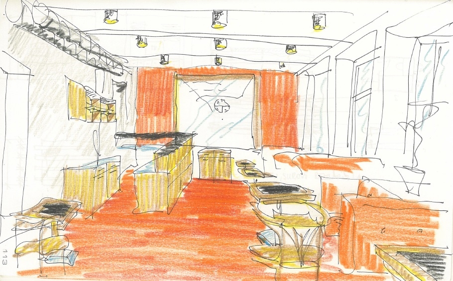 Abychom do ne zrovna ideálního prostoru umístili dostatečný počet míst k sezení a zároveň publiku zajistili pocit soukromí, zvolili jsme uspořádání nízkých boxů vycházející z tradice klasických vídeňských kaváren, kde hosté sedí poměrně blízko sebe, ale díky vzájemnému pootočení jednotlivých sezení mají dostatečné soukromí v živé kavárenské atmosféře. Ve Vídni dodnes takové uspořádání můžeme nalézt v legendárním Café Muzeum, nebo v Café Diglas na Wollzeile.
