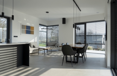 Čím výš na pozemku vystoupáte, tím krásnější výhled do údolí vám poskytne. Vjezd a vstup na pozemek je ovšem v nejnižším místě. Právě z toho vyplývá umístění a hmota stavby. Na vstup a vjezd navazuje zpevněná plocha a vjezd do garáže s technickou místností a dílnu, která je zakousnutá do svahu. Vnitřním schodiště z garáže i vnější schodiště vedou pak do obytných prostor domu usazených v horní části pozemku pro napojení na výhled. Vstup do přibližného těžiště obytného patra navazuje na obytnou společenskou část obrácenou k jižní straně i na klidnou a soukromou zónu situovanou k severozápadní straně. Obytná část díky většímu prosklení do všech tří stran a obklopení terasou navazující na zahradu je v bezprostředním kontaktu s přírodou v zahradě i výhledem do okolí. Umístěním, prosklením a přesahem střechy nabízí vstup slunce po celý den, ale zároveň prostory před sluncem kryté v rámci dne, zákoutí a plochy různých scén, atmosfér a možností všelijakého využití v rámci života v domě se zahradou. Usazení domu a návaznost na pozemek navíc umožnila vyšší světlou výšku obytného prostoru. Soukromá část dispozice pak nabízí pokoje s potřebným vybavením, výhledem do okolí a návaznost na soukromější část pozemku. Hlavní ložnice umístěná v konci dispozice dostává ranní východní slunce i západní výhled do údolí, soukromí od okolních pozemků i vlastní velkorysé vybavení.