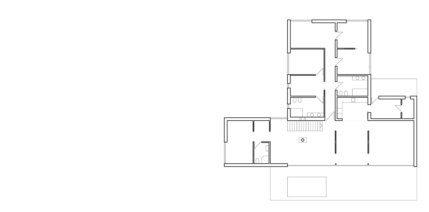 Garáž je umístěna nezávisle na hmotě domu v nejnižším místě pozemku. Vstup do domu je v úrovni suterénu. V suterénu je technické zázemí, domácí kino a sauna. Vstupní hala je propojena schodištěm s halou v úrovni přízemí. Jižní přízemní křídlo domu tvoří propojený obytný prostor, napojený na venkovní terasu. Z obytného prostoru je přístupné ložnicové křídlo s pracovnou.