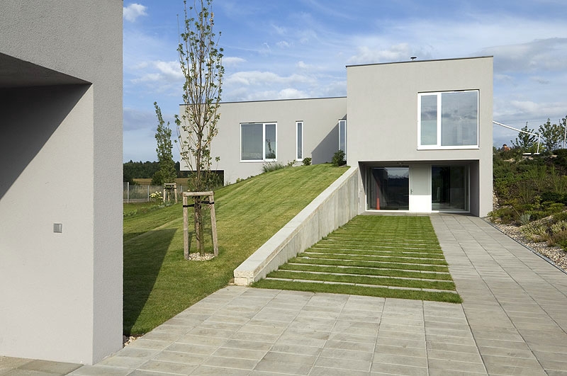 Dům je umístěn na kopci s výhledem do krajiny na všechny strany. Dvoupodlažní hmota ve tvaru písmene T má spodní podlaží zapuštěno do terénu. Výsledkem je potlačení hmoty domu v dálkových pohledech, takže působí jako přízemní. Horní podlaží je na konci odlehčeno vysunutím nad spodní.