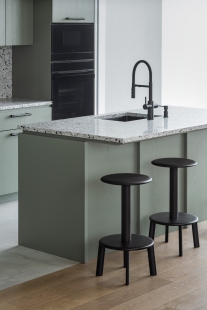 High ceilings allowed for the use of more robust standard furniture, which harmoniously fills the free space and enhances the feeling of coziness. The living room is complemented by Massif bar stools from &Tradition and Claretta Bold upholstered chairs from Miniforms, which create an impression of strength and elegance.