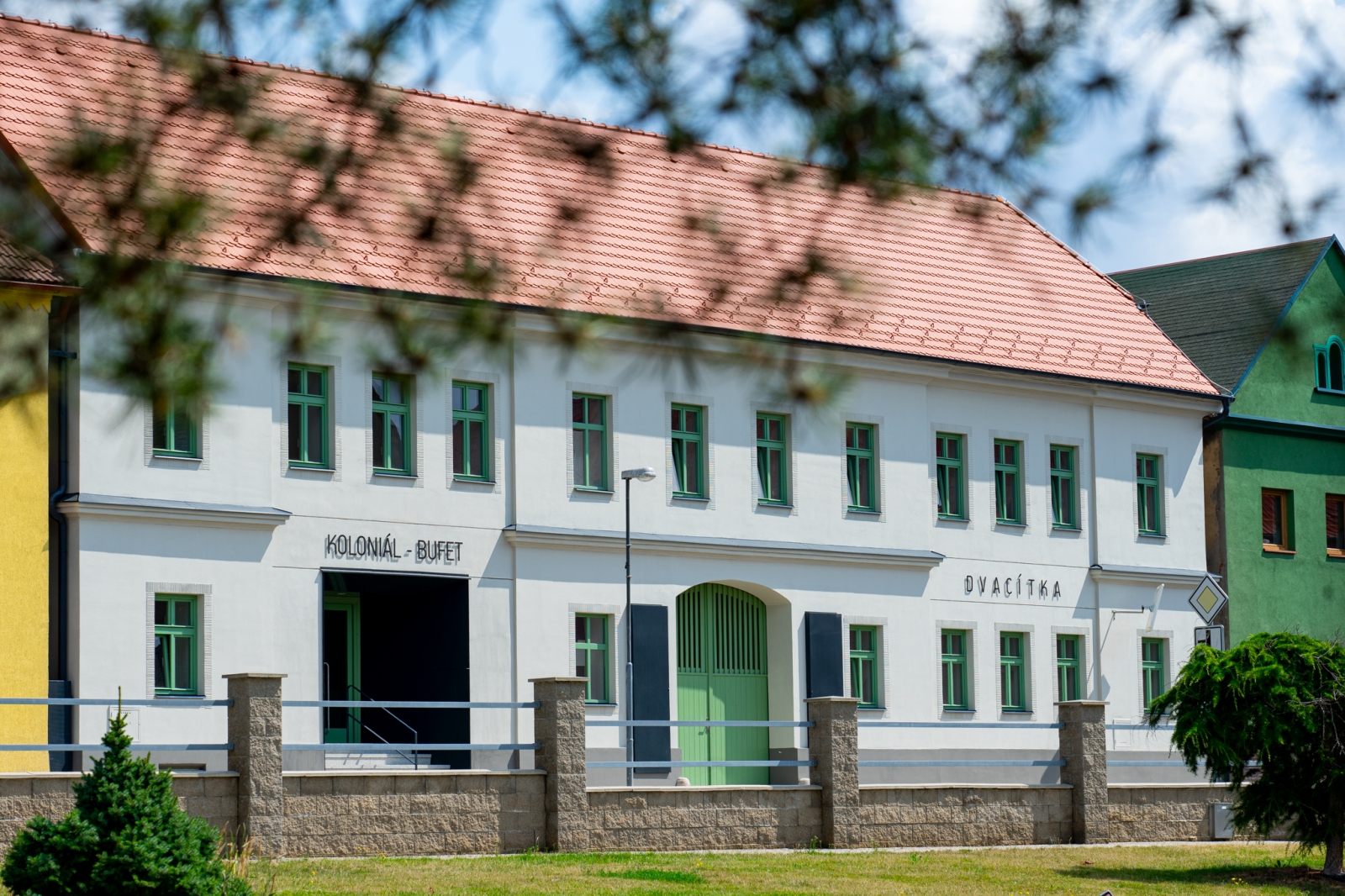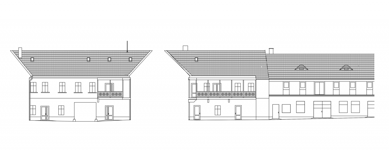 In the main facade, to the left of the passage, an entrance to a shop was previously removed from the central axis. The axial division was thus not disrupted, but the symmetry of the entire structure was affected. Given the requirement to maintain the shop, the entrance from the village square was preserved but significantly enlarged into a funnel-shaped entry to entice customers to shop. The object underwent major layout changes in the past, which, due to subsequent decay, did not allow for the reconstruction of the house to its original state. The aim of the renovation was to create a quality environment for the required services and to imprint the character of a Sudeten peasant farmhouse into the building, but not to restore its original appearance. Traditional materials were used, including wooden windows and doors, fired roofing – beaver tiles, plaster stucco, stone pavement, etc.