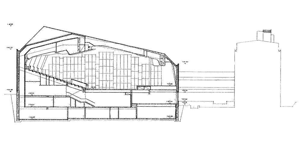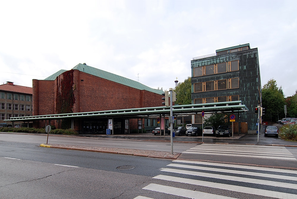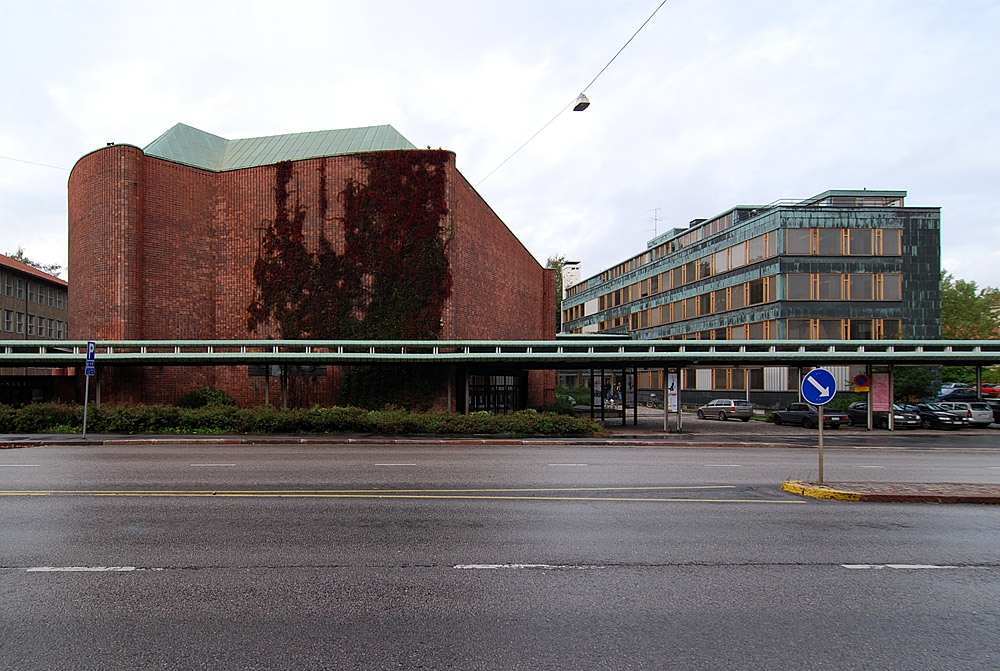 "The 'house of culture' (Kulttuuritalo) serves as a centre for the cultural work of various trade-union organizations. The building comprises three distinct parts: offices, lecture and conference rooms, a concert hall. The office part has five storeys with 110 offices, meeting rooms and two flats. In the lecture and conference room section (in the middle of a U-shaped complex) are a lecture hall, study rooms, discussion rooms, a library and a records room. The concert and congress hall is the main feature of the group. The hall, with 1500 seats and a stage 200 sq m, is primarily intended for concerts, but is also used for lectures. The various parts of the building are linked together along the street by a canopy 60m long, under which are the main entrances. The free asymmetrical form of the hall entailed the development of a new facing element, a wedge-shaped brick, with which all the curves of the irregular exterior could be realized."