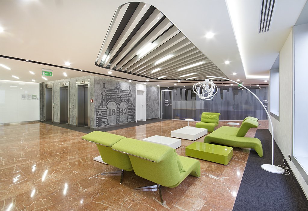 Grafika ve stěrce je krásnou ukázkou toho, že i stěna může zdobit. Na přání klienta jsme vzdali hold legendě – plzeňskému Prazdroji, a to vytvořením působivé industriální grafiky v Imitaci betonu, kde je výstižně uveden letopočet vzniku pivovaru a dominanta vstupní brány. Autorem tohoto návrhu pak bylo studio Jestico+whiles, pod vedením Radka Teichmana.