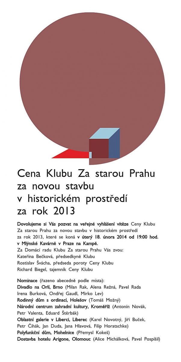 Dovolujeme si Vás pozvat na veřejné vyhlášení vítěze Ceny Klubu Za starou Prahu za novou stavbu v historickém prostředí za rok 2013, které se koná v úterý 18. února 2014 od 19:00 hod. v Mlýnské Kavárně v Praze na Kampě. Za Domácí radu Klubu Za starou Prahu Vás zvou: Kateřina Bečková, předsedkyně Klubu Rostislav Švácha, předseda poroty Ceny Klubu Richard Biegel, tajemník Ceny Klubu